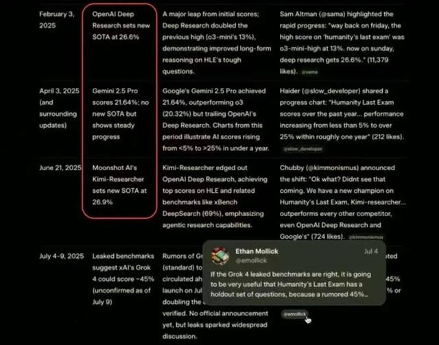 Kimi 的发布,让我们想起前天 xAI 的 Grok-4 发布会,马斯克他们宣传自己大模型推理能力时,列出了基于通用 AI 难度最高的测试「人类最后的考试」Humanities Last Exam(HLE)上几个重要突破节点。